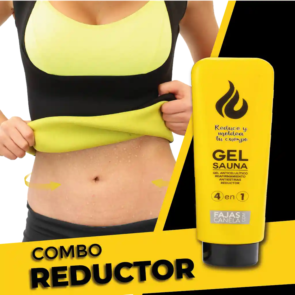 COMBO REDUCTOR, INCLUYE, 1 FAJA CHALECO + GEL REDUCTOR DE 120 ML PARA REDUCIR TALLAS Reduce significativamente tejidos grasos no deseados, estimula la quema más rápida de tejidos grasos subcutáneos y elimina las masas de grasas persistentes. Certificado Invima. Elimina Toxinas A través del sudor ( SUDA 4 VECES MÁS) Tela Inteligente Térmica para Sudar Ideal para hacer deporte, Maximiza tu Rutina Clínicamente Comprobado. Efecto Sauna Efecto Invisible ( Confort y disimula a la hora de vestir) Faja completamente inolora, no se impregnan los malos olores. Tejidos de Alta Calidad y Resistencia Tecnología Americana NeoSmart – Neotex Reduce y moldea tu figura. Gel Reductor efecto sauna. Gel anticelulítico. Gel Reafirmante. Gel antiestrias. Gel reductor abdomen. Quema calorías. Maximiza tu rutina. Incluye tapa masajeador. Aplicar en las zonas donde desee reafirmar. Aplique una capa fina del gel y deje actualizar por 10 minutos. No exceder su aplicación. Controla la Flacidez del Abdomen. Tejidos de Alta Calidad y Resistencia. Moldeadoras de Alta Calidad Tecnología Americana NeoSmart – Neotex. Hecho en Colombia