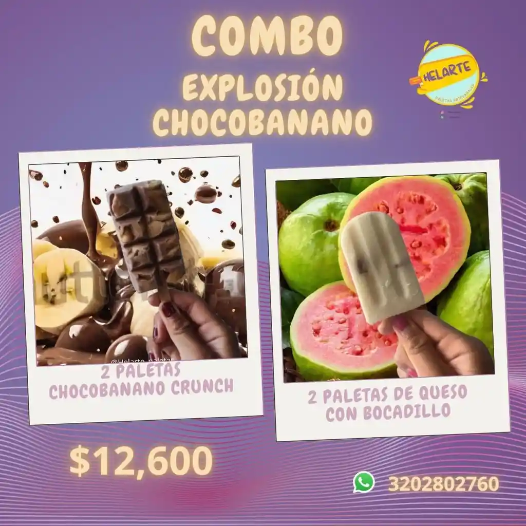 Una mezcla irresistible: 2 paletas de chocobanano y 2 de queso con arequipe. Dulce, cremoso y perfecto para los amantes del chocolate y lo tradicional.