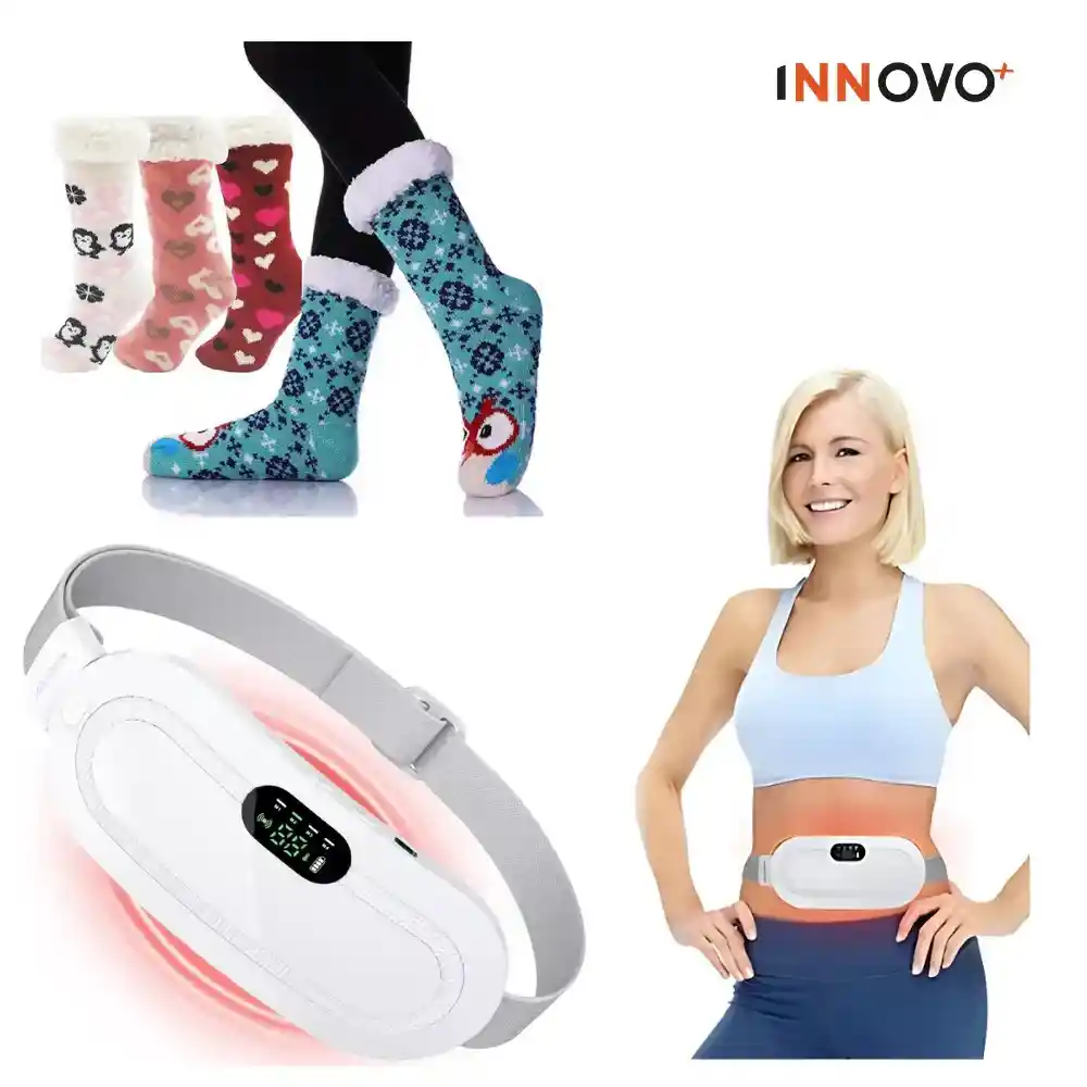 COMBO RELAX Y CONFORT Cinturón Térmico Alivia Cólicos 4 modos de vibración para un masaje personalizado Ideal para aliviar cólicos, dolor de espalda y cuello Ajustable hasta 60 grados Diseño ergonómico y fácil de usar Medias Térmicas de Peluche Ovejeras Forro interno 100% de peluche ultra suave Material que conserva el calor para mayor comodidad Suela antideslizante para mayor seguridad Perfectas para relajarte en casa ¡Dile adiós al frío y a las molestias con este combo perfecto!