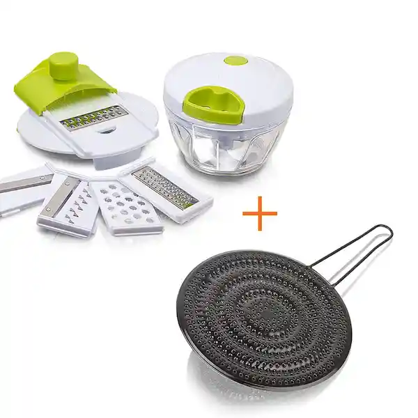 Combo Que Incluye: -Picador Para Halar + Rayador 10 Piezas: Slicer & Grater es el Combo Que te Incluye: el Cortador, Picador y Mezclador de Verduras Para Halar, Más Cinco Cuchillas, Con su Base Adicional y el Protector de Mano. -Disco Mágico Chef Master: Práctico Disco Para Asar Carne y Arepas, Evita Que se Derrame la Leche y Fácil de Lavar.