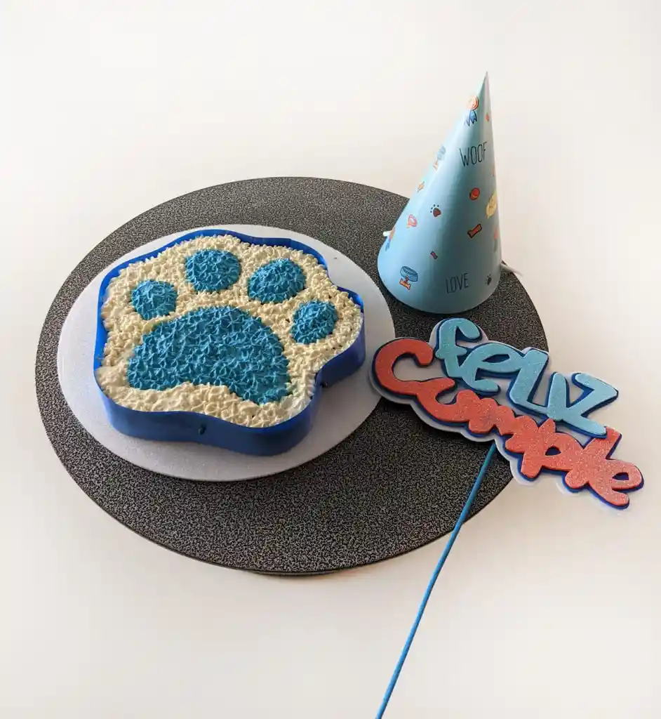 Combo de fiesta sencillo para celebrar la vida y amor incondicional de tu perrito. Incluye: Torta de 1/4 de libra en forma de huellita de color azul con blanco o rosado con blanco, gorro de fiesta color azul o rosado y topper para enterrar en la torta que dice "Feliz cumple" o "Feliz dia"