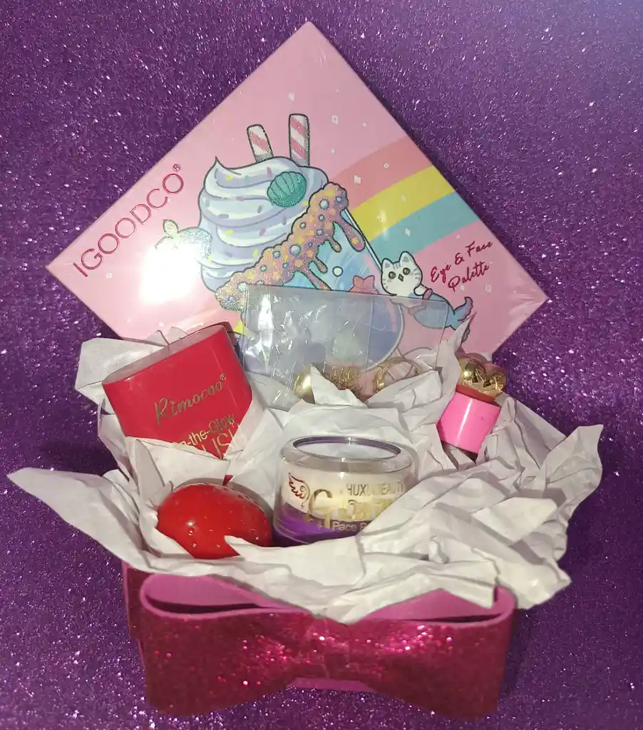 COMBO DE MAQUILLAJE IDEAL PARA ESTA NAVIDAD, CONTIENEUN BLUSH RECTRÁCTIL, UN BRILLO DE FRESITA, UN LABIAL CANDY LOVE, UN POLVO DE HADAS, DOS ANILLOS, UNA CADENA Y UNA PALETA PARA OJOS Y ROSTRO.