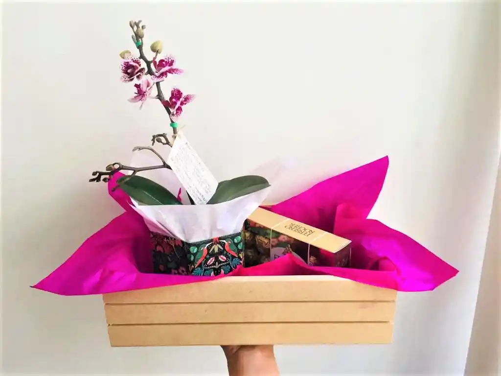 El mejor regalo, único y especial. Arreglo combo de orquídea mini y chocolate Ferrero Rocher x4 en caja de madera. Empacado para regalo. El color de la orquídea puede variar.