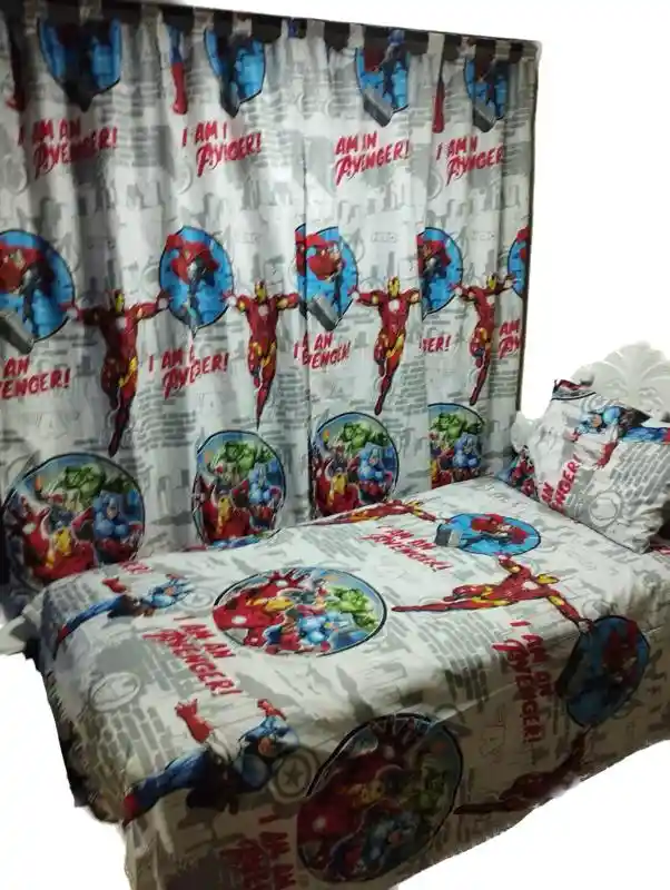 Juego de sabanas con cortinas para cama sencilla, material termifijado, no producen motas, ni destiñen. Trae: 1 Sabana, 1 Sobresabana, 1 Funda de Almohada, 2 cortinas y 2 amarraderas.