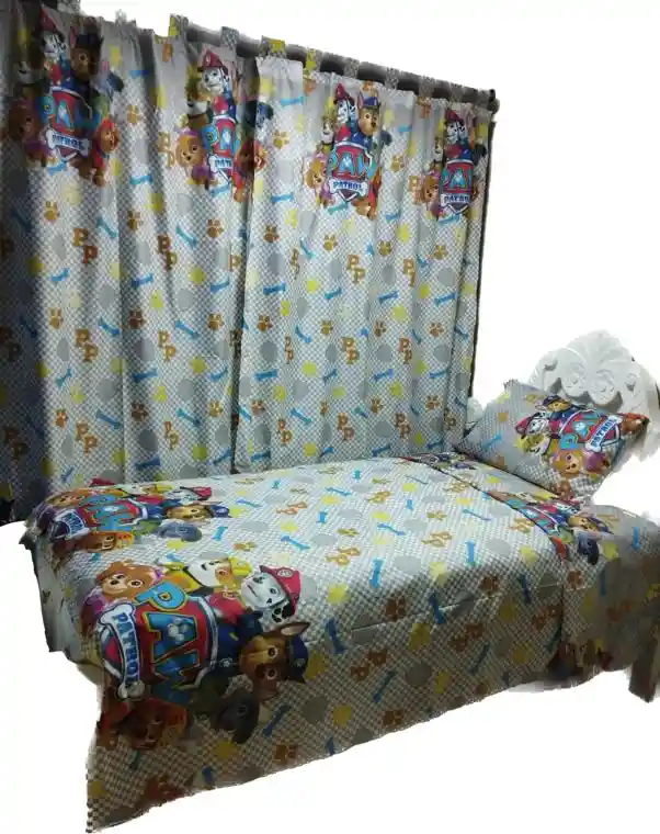 Juego de sabanas con cortinas para cama sencilla, material termifijado, no producen motas, ni destiñen. Trae: 1 Sabana, 1 Sobresabana, 1 Funda de Almohada, 2 cortinas y 2 amarraderas.