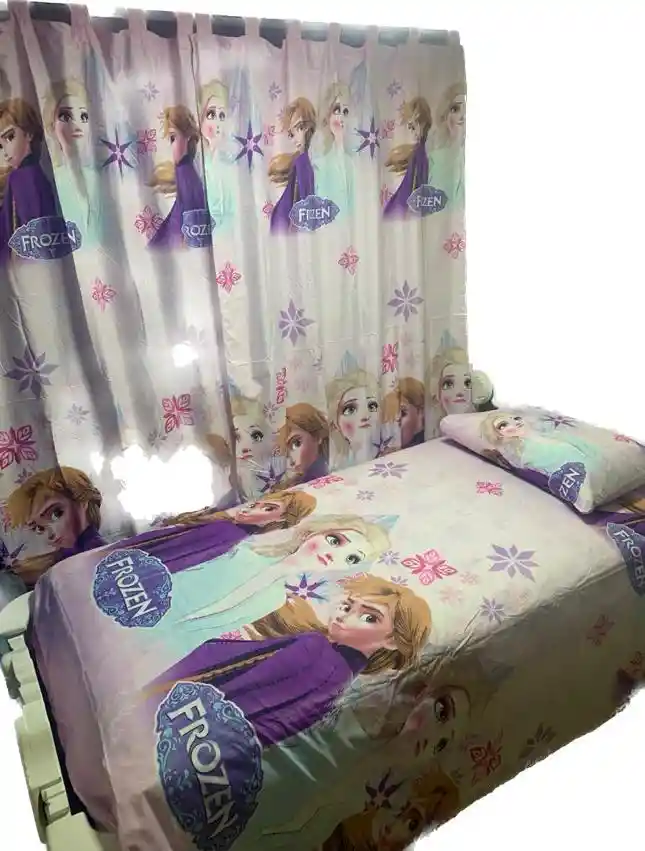 Juego de sabanas con cortinas para cama sencilla, material termifijado, no producen motas, ni destiñen. Trae: 1 Sabana, 1 Sobresabana, 1 Funda de Almohada, 2 cortinas y 2 amarraderas.