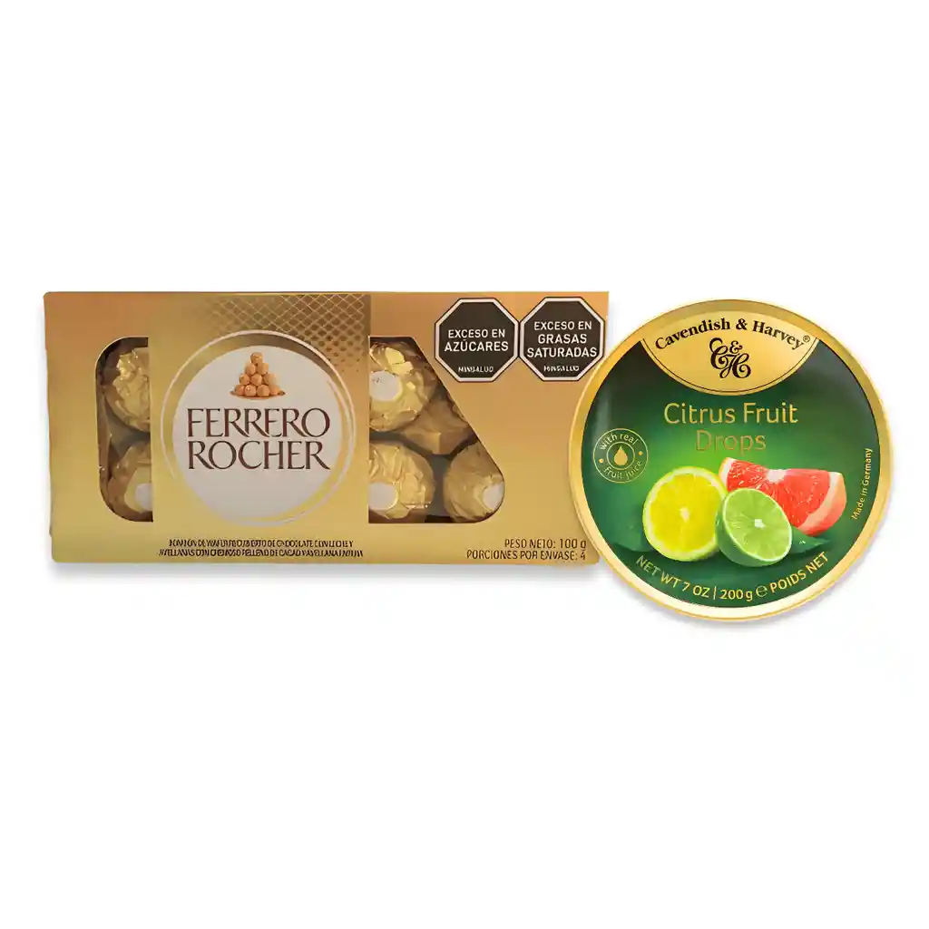 Combo Delicias Premium – El regalo perfecto para cualquier ocasión El Combo Delicias Premium es una opción sofisticada para sorprender con una selección de dulces refinados y detalles elegantes. Diseñado para crear momentos especiales, combina sabores irresistibles con una presentación cuidada, lista para regalar en cualquier ocasión. Incluye: Ferrero Rocher x 8 unidades: el clásico bombón de chocolate con avellana, relleno cremoso y cubierta crujiente. Un ícono de la repostería fina que deleita a todos los paladares. Cavendish & Harvey 175 g: exquisitos caramelos alemanes de calidad gourmet, presentados en su emblemática lata dorada. El sabor se despacha según disponibilidad, entre sus tradicionales variedades frutales como Mixed Fruit, Tropical Fruit o Citrus Candies. Papel decorativo y moño: presentación elegante y lista para entregar, ideal para quienes buscan un detalle con estilo y distinción. Perfecto para regalar Este combo es ideal para cumpleaños, aniversarios, celebraciones corporativas o detalles personales. Su equilibrio entre sabor, calidad y presentación lo convierte en un regalo versátil y memorable. Por qué elegirlo Contiene productos reconocidos por su calidad y presentación premium. Empaque decorativo con moño, listo para regalar. Sabores variados que se adaptan a cualquier gusto. Ideal para sorprender en cualquier ocasión especial. Recomendaciones de conservación Mantener en un lugar fresco y seco, alejado de la luz solar directa. Consumir los productos antes de la fecha de vencimiento indicada en cada empaque.