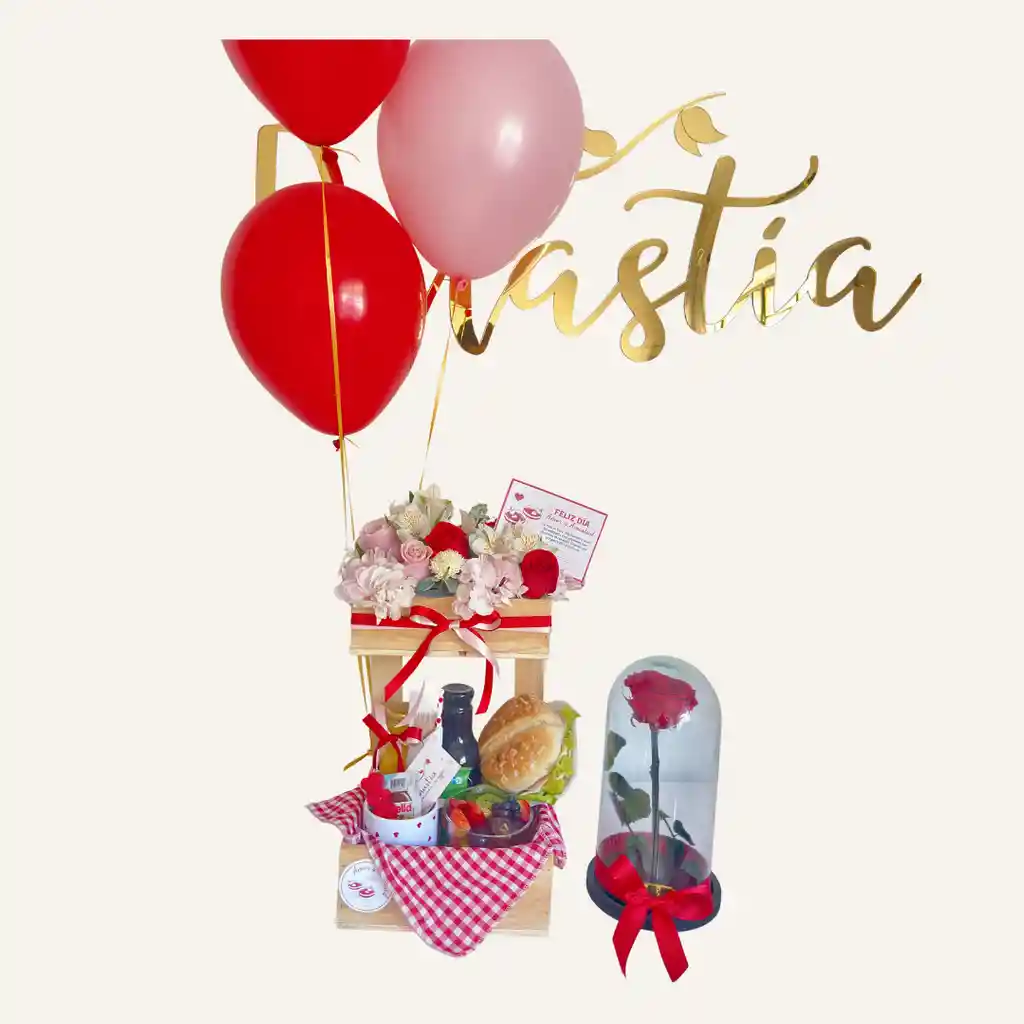 Mesa floral en madera con flores, jugo de naranja, ensalada de frutas, sándwich, galletas tosh, mug con nutella mini y vela con aroma pañoleta de tela roja y 3 globos en helio. cúpula con rosa preservada 30 Cm roja o rosada y tarjeta con dedicatoria.