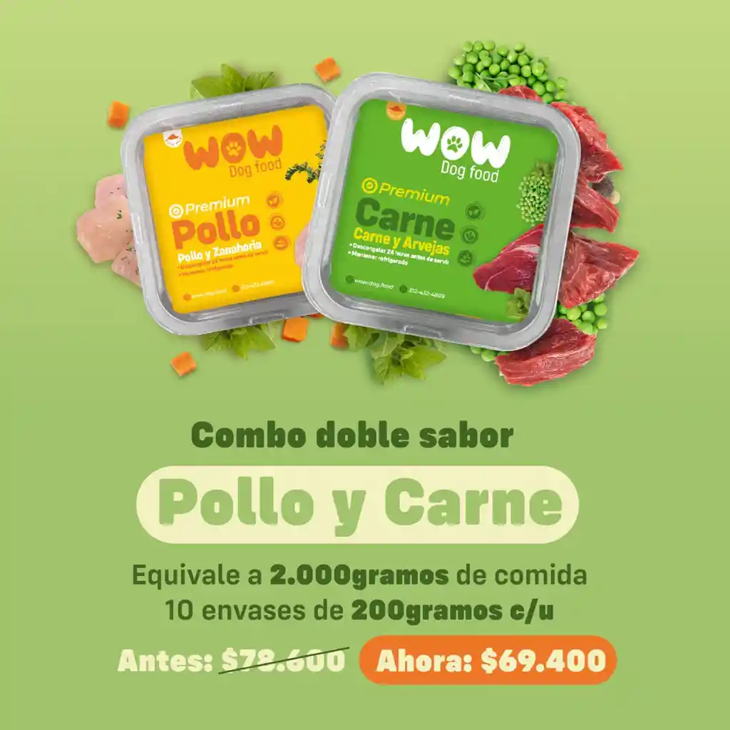 ¿Quieres darle a tu perro lo mejor de ambos mundos? Entonces no te pierdas esta increíble oferta: Pollo con Zanahoria + Carne de res por solo $69.400. Con este combo, podrás ofrecerle a tu peludo amigo dos opciones diferentes de comida, ambas elaboradas con ingredientes naturales y de alta calidad, que le aportarán todos los beneficios que necesita para su salud y bienestar. Con el Pollo con Zanahoria, le darás a tu perro una comida suave y deliciosa, ideal para los que tienen estómagos delicados o gustos exigentes, esta combinación de pollo, zanahorias y arroz le proporcionará una opción nutritiva y sabrosa, especialmente diseñada para satisfacer las necesidades de los perros más sensibles o selectivos en cuanto a su alimentación. Con la Carne de res, le darás a tu perro una comida poderosa y energética, ideal para los que necesitan un extra de vitalidad y actividad, esta combinación de carne de res, arvejas y espinaca le ofrecerá una explosión de nutrientes esenciales, que le ayudarán a moverse con energía y vitalidad, asegurando que esté bien nutrido en cada etapa de su vida. No dejes pasar esta oportunidad y aprovecha esta promoción limitada. ¡Tu perro te lo agradecerá! 🐶