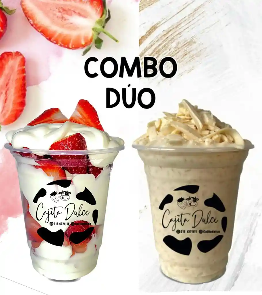 1 vaso de fresas con crema tamaño grande y 1 vaso de arroz con leche con queso tamaño grande.