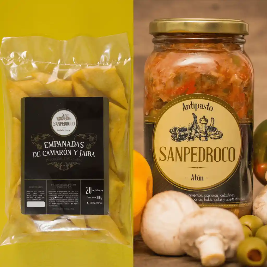Empanadas de camarón y jaiba acompañados de un frasco de antipasto de atún de 500 gramos