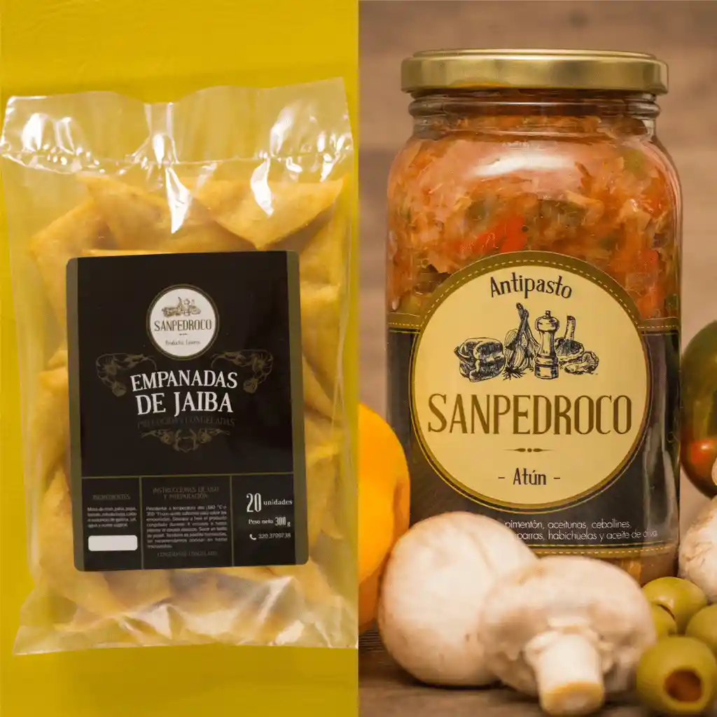 Empanadas de jaiba acompañados de un frasco de antipasto de atún de 500 gramos