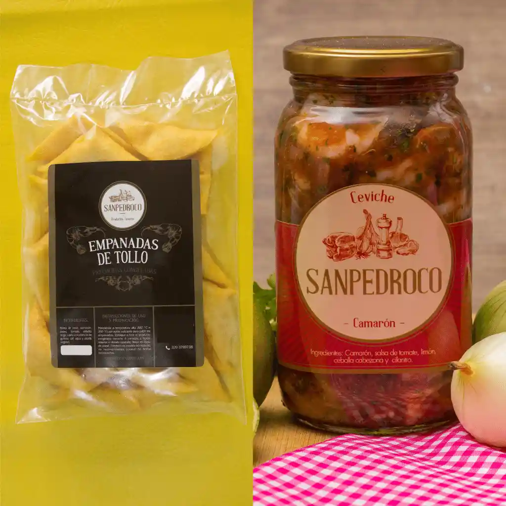 Empanadas de tollo acompañados de un frasco de ceviche de camarón de 250 gramos