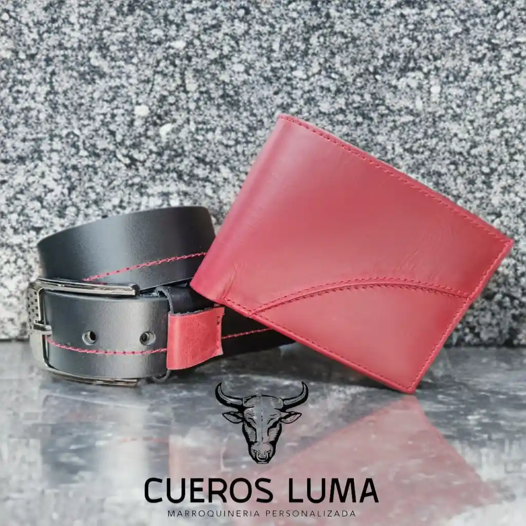 Combo en cuero genuino color rojo con billetera y correa en cuero sinvec con chapa plana o clásica