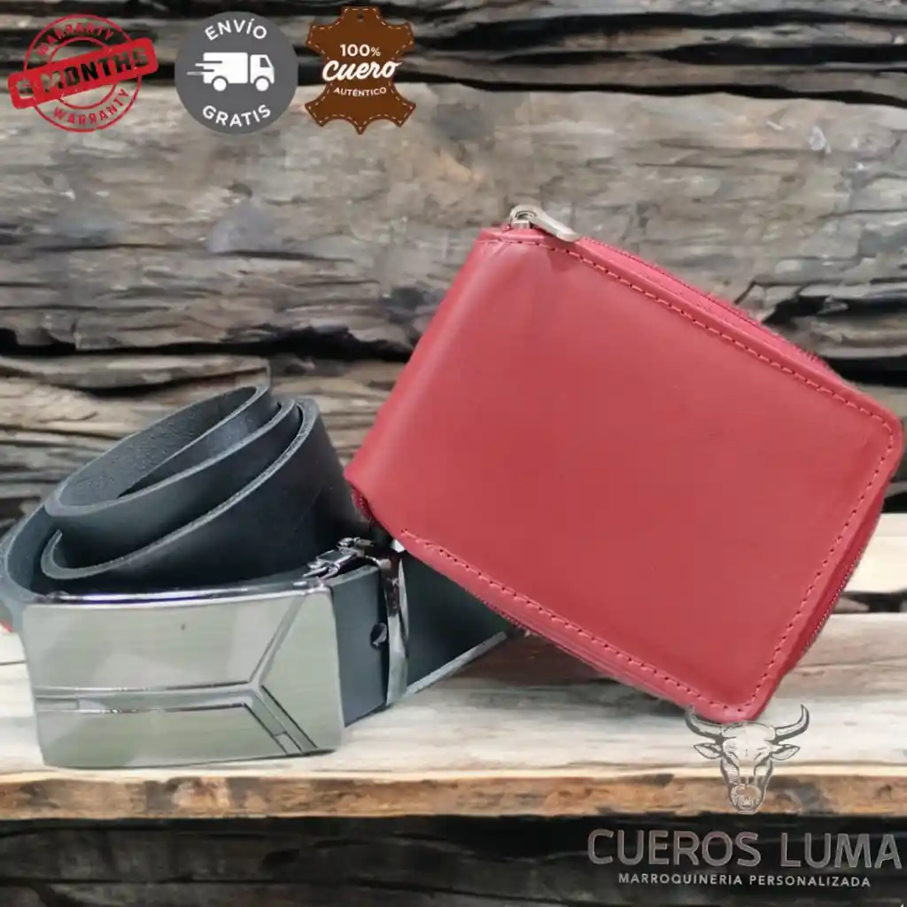 Combo en cuero genuino color rojo con billetera y correa en cuero sinvec chapa plana o de hebilla clásica