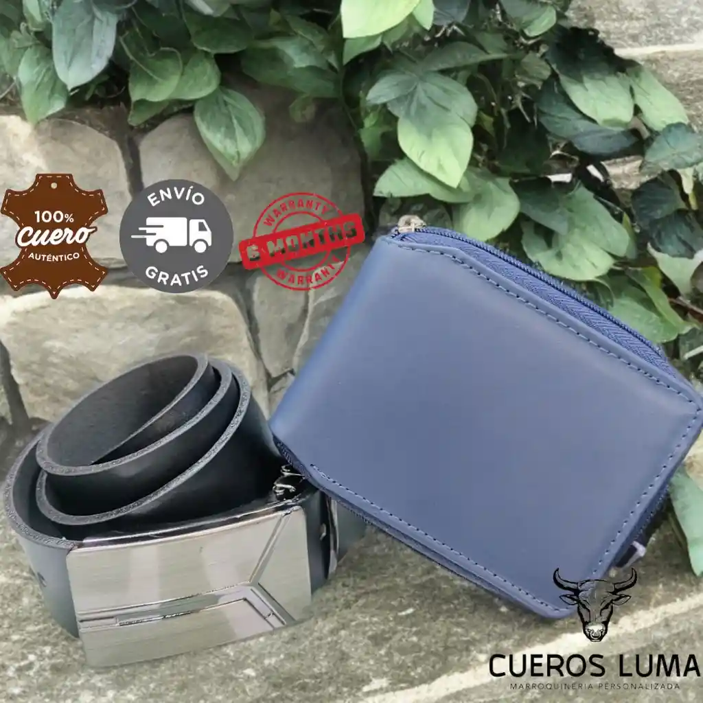 Combo en cuero genuino color azul con billetera y correa en cuero sinvec