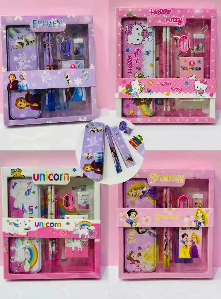 Combo temático de soplar para niña que incluye cartuchera, borrador, tajalapiz, dos lápices y crayolas