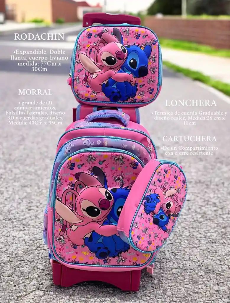 *COMBO x4 ESCOLAR* Combo regreso a clases | Niña 💖 *INCLUYE* *MORRAL* •(3) compartimientos ( Grande principal - Mediano delantero - pequeño delantero) •Bolsillos laterales con malla •Cuerdas Graduables •Diseño con realce •cierre resistente con clips decorativos *Medida morral:* 40Cm x 33cm *Material:* Tela Gruesa excelente calidad *LONCHERA* •Térmica por dentro •Cierre resistente •Cuerda Graduable •Diseño realce *Medida lonchera :* 25Cm x 20Cm *Material:* Tela Gruesa excelente calidad *CARTUCHERA* •(1) Compartimiento espacioso •Diseo realce •cierre resistente *Media cartuchera:* 24Cm x 14Cm *Material:* Tela Gruesa excelente calidad *RODACHIN* •Doble llanta •Estable y liviano •Llantas de goma •Cuerpo Expandible *Medida:* 77 Cm x 30Cm