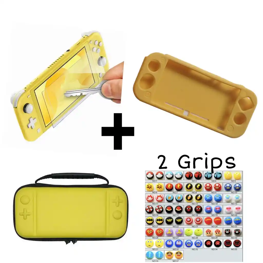 *¡¡BIENVENIDO A TONATEK!!* 1. CARACTERISTICAS DE LA COMPRA: 1.1 Esta compra incluye: - 1 Combo Estuche Lite Amarillo + Silicona Transparente + 2 Grips + Vidrio Lite Compatible Con Switch 1.2 Características del producto: El combo de estuche, funda de silicona, vidrio protector y grips compatible con Nintendo Switch Lite es una solución práctica para proteger la consola y mejorar la experiencia de juego. El estuche rígido color amarillo permite guardar y transportar la consola de forma segura, ayudando a protegerla de golpes, polvo y rayones cuando la llevas en mochilas o bolsos. La funda de silicona transparente se ajusta al cuerpo de la consola y brinda protección adicional contra rayones y desgaste, manteniendo visible el diseño original.