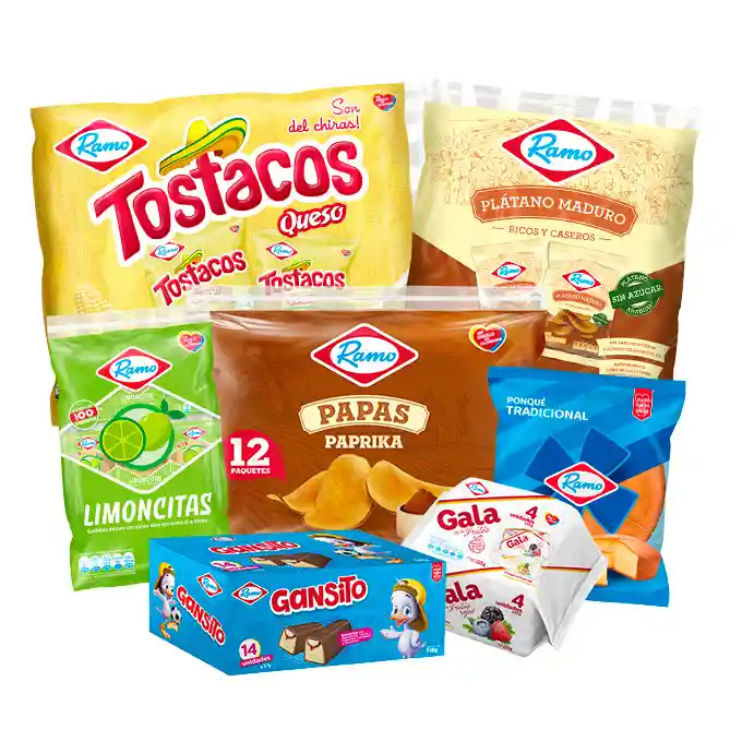 Ramo Platano Maduro 40Gr X8 Und + Tostacos Queso 38Gr X12Und + Gala Tajada Frutos 55Gr X4 Und + Papas Paprika Docena + Gansito 37Gr X14 Und + Populares Limoncitas 342Gr + Ponqué Ramo Tradicional X 230Gr