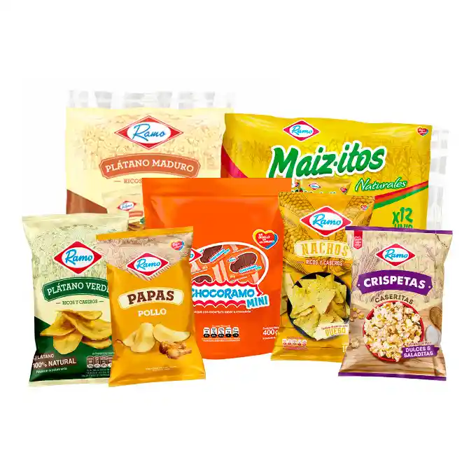 Nachos Ramo Natural 190Gr + Maizitos Natural 500Gr X12 Und + Papas Caseras Pollo 105Gr + Ramo Platano Verde 140Gr + Crispetas Familiar Sal Y Dulce 125Gr + Chocoramo Mini 400Gr + Ramo Platano Maduro 40Gr X8 Und