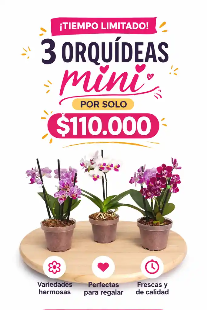 Sorprende con un detalle que enamora 💕 Nuestro Combo floral de 3 Orquídeas Mini es perfecto para regalar o llenar de vida cualquier espacio. 🌿 Incluye 3 orquídeas mini en flor 🎁 Ideales para cumpleaños, amor, agradecimiento o sorpresa 💐 Variedades surtidas (cada combo es único) 📦 Listas para regalar 💖 Un detalle elegante, natural y lleno de significado, que dura mucho más que un ramo. ⏰ Promoción por tiempo limitado 🚀 Pídelas ahora por Rappi y recíbelas en minutos