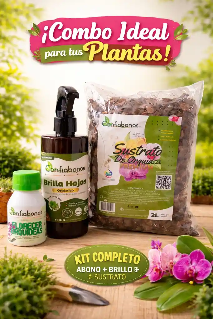 Combo esencial para el cuidado de tu orquídea: Florecer Orquídeas: estimula y fortalece la floración (80ml) Sustrato premium: mezcla ideal que mejora el drenaje y desarrollo de raíces (400gm) Brilla hojas orgánico: limpia, protege y realza el brillo natural (250ml)