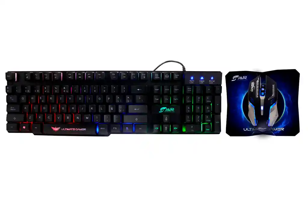 Combo Gamer Multimedia edición especial Thunder 3 en 1: Teclado, Mouse y Mouse Pad con diseño exclusivo J&R, iluminación LED, 12 teclas multimedia, mouse 4D (4 botones), scroll dentado para un mayor agarre, DPI ajustable (800-2000), mouse pad con forma y diseño exclusivo J&R 20 * 18 * 0.2 cm.