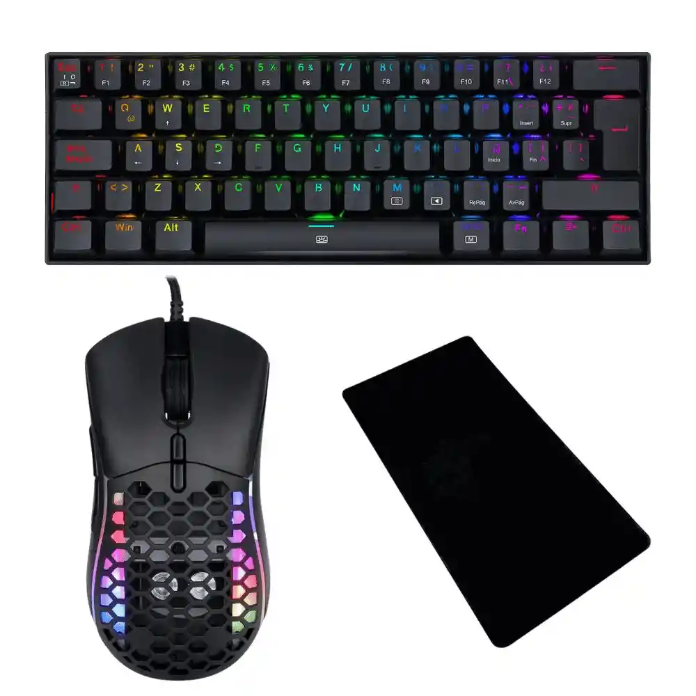 1.TAMAÑO COMPACTO, POTENCIA MÁXIMA El Dragonborn K630RGB es un teclado mecánico 60%, ideal para juegos competitivos gracias a sus switches Redragon Brown, tecla Fn, bloqueo de tecla de Windows y cable desmontable. 2. SWITCHES REDRAGON: DURABILIDAD Y RESPUESTA RÁPIDA Equipado con interruptores mecánicos Redragon con una vida útil de 50 millones de clics, resistentes al polvo y las salpicaduras, y preparados para cambio rápido o «hot swap». 3. ESPACIO OPTIMIZADO: LIBERTAD PARA EL RATÓN El diseño compacto del Dragonborn permite más espacio en tu escritorio para el ratón, ideal para juegos tipo FPS donde la movilidad es clave. 4. RETROILUMINACIÓN RGB PERSONALIZABLE El Dragonborn K630RGB ofrece 13 perfiles de iluminación RGB personalizables, con ajuste de brillo y velocidad de los efectos de luz directamente desde el teclado. 5. RATÓN T60: CONTROL PRECISO Y PERSONALIZACIÓN El Mouse Gamer USB T60 cuenta con 7 botones programables, retroiluminación RGB, diseño ergonómico con 2 cubiertas intercambiables y 6 láminas de peso ajustables, además de una resolución de hasta 7200 DPI para una experiencia de juego óptima.
