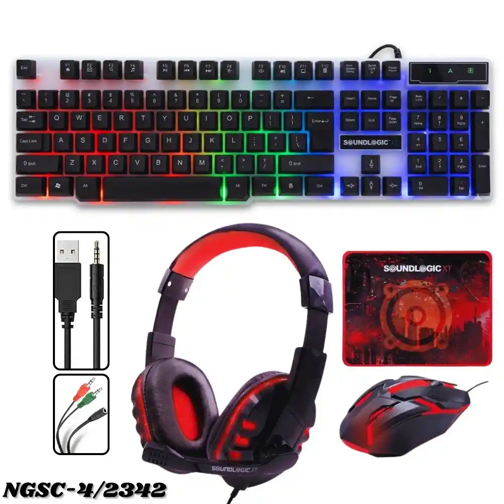Combo Gamer Teclado Mouse Mousepad Diadema Soundlogic Kit Gamer 4 En 1 ¡Lleva tu experiencia gamer al siguiente nivel con el Combo Gamer X4 Soundlogic ! Este set todo en uno incluye teclado, mouse, mousepad y diadema, diseñados para ofrecer rendimiento, comodidad y estilo en cada partida. Caracteristicas: - Teclado con retroiluminación LED y diseño ergonómico, ideal para largas sesiones de juego. - Mouse óptico con alta precisión y ajuste de DPI para mayor control. - Mousepad con superficie antideslizante y textura optimizada para un deslizamiento suave. - Diadema con sonido envolvente y micrófono integrado, perfecta para una comunicación clara en tus juegos online. Especificaciones: - Modelo: NGSC-4/2342 - Interfaz: USB. - Compatibilidad: Xbox One, PS4, PC. - Resolución mouse: 1200 DPI. El Combo Soundlogic combina funcionalidad y estética gamer para brindarte una experiencia completa y accesible. ¡Prepárate para jugar como un profesional! NOTA: El teclado NO tiene letra Ñ