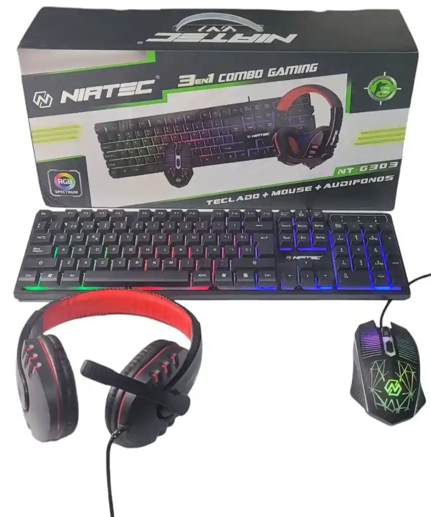Combo Gaming 3 En 1 Teclado + Mouse Gamer + Audífonos. Niatec TECLADO Iluminación colorida Serigrafía en paneles cable 1,35M Tamaño 434*131*32mm MOUSE GAMER DPI estándar: 800-1200-1600 Cable: Línea PU 2,8mm * 1,2 M Cambiar: 3 millones de veces Modo de luz: respiración colorida materiales: ABS AUDÍFONOS Rango de frecuencia: 20-20 KHz AUD Potencia nominal: 100 mW Enchufe: diámetro 3,5 mm x 1,7 m. Longitud del cable: 2m Impedancia: 32Ω/Hz Color: blanco y negro cable de PU MOUSE Cordón Tejido Scroll Anti-Deslizante Diseño Ergonómico Logo Iluminación Led AUDIFONOS Diseño Ergonómico Almohadilla Suave Micrófono Incorporado. ***************TERMINOS DE GARANTÍA Y RECTRACTO********************** 1. Todos nuestros productos cuentan con garantía de fábrica, la cual puedes visualizar en cada publicación, la garantía no cubre daños ocasionados por el comprador. 2. En caso de recibir el producto con alguna falla o desperfecto por favor contáctenos por nuestros canales de comunicación, en la mayoría de ocasiones podemos solucionar mucho más ágilmente de manera directa. Normalmente respondemos en menos de 24hrs. 3. Para cualquier tipo de reclamación el producto debe ser devuelto en su empaque original, accesorios completos, forros, protectores, manuales y sin evidencias de uso o mala manipulación.