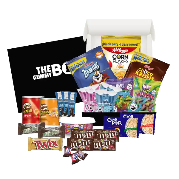Contiene. Tarro Naps Sour Tubitos 210 g + Napsmelos Naps 4 x 20 g c/u + Barquillos Napolinos 3 x 14 g c/u + 1 Gomas Naps Rings 100 g + Gomas Naps Sour Worms 100 g + M&M Chocolate 4 x 13.2 g c/u + Twix 50,7 g + Crispetas Cine Pop 2 x 85 g c/u + Snickers Mini 3 x 9 g c/u + Milky Way Funsize 2 x 15.9 g c/u + Zucaritas Extra Bolsa 156 g + Corn Flakes Miel Bolsa 120 g + Choco Krispis Mega Bolsa 90 g + Papas Pringles Original 37 g + Papas Primgles Queso 40 g