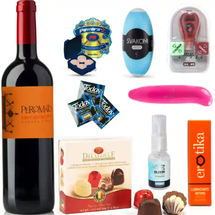 Con este combo tienes todo lo necesario para pasar un momento especial con tu pareja. Contiene: Vino tinto Chocolates Lubricante Condones x 3 unidades Vibrador Hot Pepper Huevo masturbador para hombre Limpiador de juguetes PowerSex (estimulante sexual) Dados para jugar