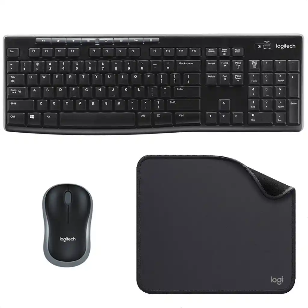 LOGITECH MK270, COMBO INALÁMBRICO TECLADO MULTIMEDIA Y MOUSE • TECNOLOGÍA INALÁMBRICA DE GRAN ALCANCE Ofrece una conexión fiable y rápida hasta 10 metros, sin apenas retrasos ni interrupciones gracias a la conectividad inalámbrica avanzada de 2,4 GHz de Logitech.1 • MOUSE DISEÑADO PARA LOS DESPLAZAMIENTOS Puedes llevarte este compacto mouse allá a donde vaya tu computadora. • LARGA DURACIÓN DE LAS BATERÍAS Funciona durante meses sin cambiar las baterías. Un conmutador de encendido/apagado ahorra batería. • TECNOLOGÍA INALÁMBRICA AVANZADA DE 2,4 GHZ Trabaja o juega en más lugares. La conexión inalámbrica elimina virtualmente todos los retrasos, interrupciones e interferencias y proporciona un alcance de 10 metros.1 • MOUSE COMPACTO Llévate el mouse a donde sea. Este cómodo mouse cabe fácilmente en las fundas y bolsas de computadora para viajar allá a donde vayas. • DURACIÓN DE BATERÍAS PROLONGADA Las baterías del teclado ofrecen una duración de 36 meses y las del mouse 12, y mientras tanto vive sin preocupaciones de cambios de baterías.2 • OCHO BOTONES DE ACCESO RÁPIDO Acceso instantáneo a los controles de reproducción: películas, música, Internet, correo electrónico, funciones de reproducción/pausa, volumen y mucho más. Todo con un solo toque. • TAMAÑO NORMAL El teclado de tamaño normal con teclado numérico, teclas de dirección y nueve teclas F es cómodo, práctico y robusto. REQUISITOS DEL SISTEMA PC con Windows Windows Vista®, Windows® XP, Windows 7, Windows 8, Windows 10 puerto USB Chrome OS™ ESTA CAJA CONTIENE Teclado EN ESPAÑOL (incluye la tecla ñ) Mouse Nano receptor Dos baterías AAA (teclado) y una batería AA (mouse) Documentación del usuario +++++++++++++++++++++++++++++++++++++++++++++++++++++++++++ Pad Mouse Logitech Studio Series 230x200mm Alfombrilla Suave DESLIZAMIENTO PERFECTO Ésta es la suave alfombrilla de mouse antideslizante que mejora tu espacio de trabajo. Hecha con materiales de alta calidad, la alfombrilla de mouse Logitech te ofrece la facilidad de deslizamiento y el confort que necesitas para tu mouse Logitech favorito. FLUIDEZ Y SILENCIO La suave superficie de tejido fino causa menos fricción y facilita el deslizamiento del mouse, tanto en la oficina como en casa. RESISTENTE A SALPICADURAS La alfombrilla de mouse Logitech posee un recubrimiento a prueba de salpicaduras que resiste posibles percances, permitiendo limpiar fácilmente líquidos derramados. MATERIALES ELEGIDOS CON ESMERO La base antideslizante tiene caucho natural, mientras que el suave y confortable tejido de la superficie y la capa interior 313% del peso total son de poliéster reciclado que da una segunda vida a las botellas de PET. DESLIZAMIENTO PURO. EN SU SITIO. La superficie de tela suave proporciona una confortable experiencia de uso del mouse, mientras que la base antideslizante de goma la mantiene firmemente en su posición sobre el escritorio, pase lo que pase. DURABILIDAD Bordes de pespunte plano que no se deshilachan y hacen la alfombrilla más duradera. VA BIEN CON LOS DISPOSITIVOS LOGITECH Está pensada como complemento de tu mouse Logitech y otros accesorios. Además de mejorar la organización de tu espacio, también lo hace más atractivo. ESPECIFICACIONES Dimensiones Alfombrilla de mouse Altura: 200 mm Ancho: 230 mm Grosor: 2 mm Peso: 73 g Especificaciones técnicas Studio Series Materiales 100% POLIÉSTER RECICLADO Superficie y capa interior 513% del peso total BASE ANTIDESLIZANTE 72% caucho natural 6Los productos que contienen látex de caucho natural pueden provocar reacciones alérgicas a algunas personas. BORDES QUE NO SE DESHILACHAN Nylon + Poliéster CONTENIDO DE LA CAJA Alfombrilla de mouse Documentación del usuario