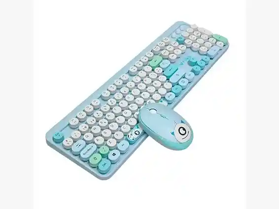 conjunto de teclado y mouse diseñado con una estética retro y colorida, destacando por sus teclas redondas y su conectividad mediante un único receptor USB de 2.4 GHz