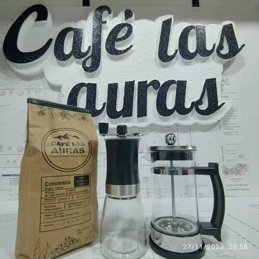 una libra de café de especialidad, una prensa francesa de 330 ml trendy y un molino en vidrio trendy