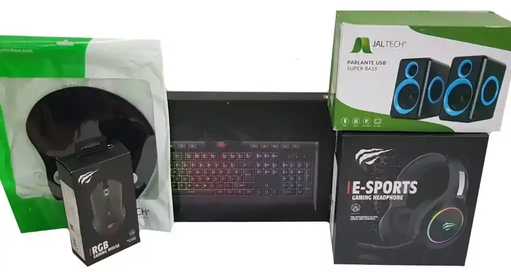 MOUSE: Ratón gaming RGB MS1006 Con 4 niveles de DPI ajustable 1000-1600-2400-3200DPI y diseño ergonómico para que la mano se adapte perfecta y cómodamente para largas jornadas de juego También, cuenta con superficie antideslizante. Mouse Gamer de Tamaño ergonómico compatible con cualquier sistema operativo que ofrece una respuesta eficiente en cualquier entorno y para cualquier nivel de desempeño. Ideal para Jugadores de alto rendimiento *Puerto: USB *Tamaño: 125 -70- 40 mm *Número de teclas: 7 *Resolución: 1000-1600-2400-3200 DPI *Vida de las teclas: 3 millones de veces. *Longitud del cable: 1,5 mRatón gaming RGB MS1006. Con 4 niveles de DPI ajustable 1000-1600-2400-3200DPI y diseño ergonómico para que la mano se adapte perfecta y cómodamente para largas jornadas de juego. También, cuenta con superficie antideslizante. TECLADO: Potentes Luces LED en tres colores *Conectividad USB *Vida de teclas: 5 millones de veces *Teclas multimedia *Diseño Gamer *Cable de 1.5mts *Numero de teclas 144 *Soporta sistemas Windows 2000 en adelante, Linux y Mac *Luces On y Luces Off *Úsalo en oficinas u hogares *Dimensiones del Producto en Cms: Ancho 46, Alto 4, Largo 19. Peso en Kgs: 0.80 *Dimensiones del Empaque en Cms: Ancho 52, Alto 7, Largo 26. Peso en Kgs: 1 AUDIFONOS: Modelo: H2232D * Color: Negro * Diametro de bobina: 50mm dia.dome Z * Resistencia: 21± 15% * Sensibilidad: 109dB ± 3dB * Correspondencia de frecuencia: 20Hz a 20KHz * Micrófono: 4.01.5mm *Cable: 2.2m * Clavija: 3.5MM+USB PARLANTES:JALTECH *super bass. *conexion usb 5 v dc. *plug de audio3,5 mm. *resonadores laterales para una mejor acusticade audio. *control de volumen en cable. *relacion señal/ruido: 65 db. *tasa de aislamiento: 45 db *sensibilidad: 500mv *frecuencia de respuesta de: 20hz-18khz. *impedancia: 4 ohm. *unida de altavoz: 52mm. *potencia 3wx2/rms. Parlantes USB super bass, con excelente diseño, este producto cuenta con las siguientes características: -Conexión USB. -Salida de audio 3.5MM. -Bajos. -6 Watts. PAD MOUSE: - Bordes reforzados para mayor durabilidad. * Almohadilla apoya muñeca de espuma. * Diseño ergonómico. * Antideslizante. * Superficie resistente a salpicaduras. * Materiales de alta calidad, antideslizante, de goma gruesa y resiste a salpicaduras.