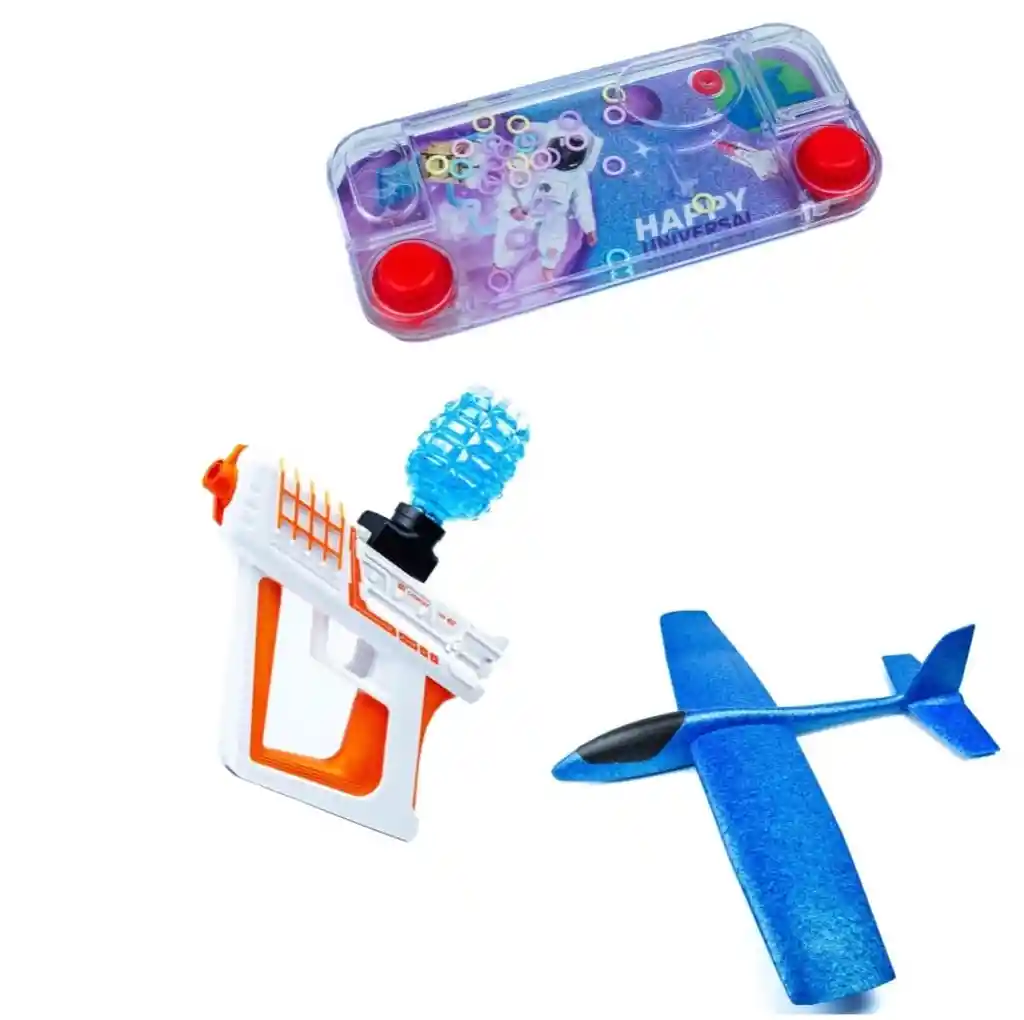 CONTIENE AVION PLANEADOR DIDACTICO, LANZADORA DE BOLAS DE GEL, JUEGO DE AGUA ESPACIAL Avión Planeador 49 cm: ¡Lleva la diversión a nuevas alturas con este increíble avión planeador de 49 cm! Diseñado para ofrecer horas de entretenimiento al aire libre, este avión de gran tamaño es perfecto para que los niños disfruten de vuelos largos y emocionantes. Hecho de materiales livianos y resistentes, es fácil de lanzar y controlara perfectamente su vuelo, brindando una experiencia de vuelo estable y segura. Con un diseño aerodinámico y colores vibrantes, este avión planeador es ideal para fomentar la destreza motriz, la coordinación y la creatividad mientras los pequeños se divierten explorando el cielo. ¡Perfecto para días de diversión al sol! Lanzador de bolas de gel: ¡La diversión está garantizada con el Lanzador de Bolas de Gel! Este juguete innovador permite a los niños lanzar pequeñas bolas de gel, que son suaves y seguras, para crear momentos de acción y aventura. Perfecto para jugar al aire libre, el lanzador es fácil de usar y proporciona horas de entretenimiento mientras desarrolla la coordinación y la precisión. Las bolas de gel son biodegradables, lo que hace que el juego sea no solo divertido, sino también amigable con el medio ambiente. Ideal para jugar con amigos o familiares, ¡el Lanzador de Bolas de Gel promete emoción y risas! Juego de Agua Espacial en Caja DSP: ¡Sumérgete en una aventura intergaláctica con el Juego de Agua Espacial en Caja DSP! Este emocionante juguete permite a los niños disfrutar de un juego acuático mientras exploran un mundo de fantasía espacial.