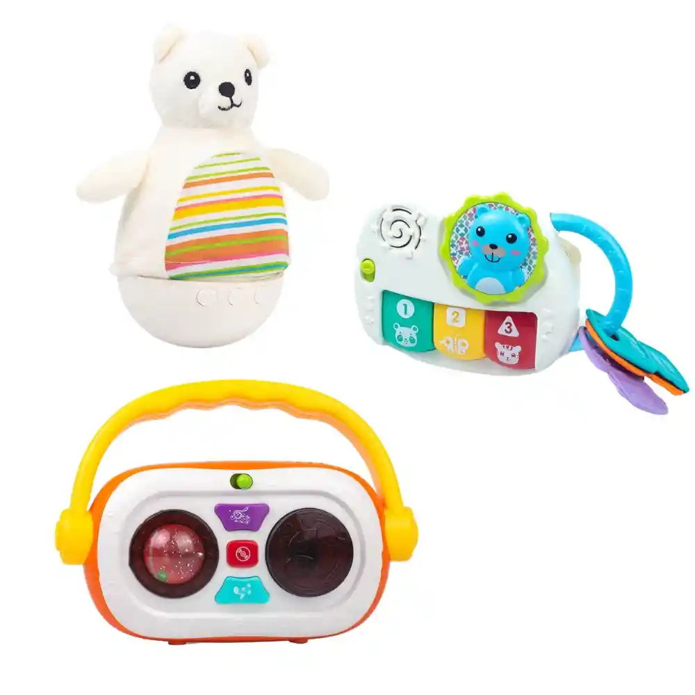 CONTIENE OSITO DIDACTICO, TABLETA INTERACTIVA Y LLAVES DIDACTICAS CON LLAVERO DIDACTICO. ¡El regalo perfecto para el bebé en su primer año! Este Super Combo de Juguetes incluye tres adorables y suaves juguetes diseñados para estimular los sentidos y el desarrollo temprano del bebé. Con un patico amarillo que encanta por su color brillante, un sonajero divertido que atrae la atención, y un peluche tierno para abrazar, este set tiene todo lo necesario para acompañar al bebé en sus primeras etapas de exploración. Contenido del Combo: Sonajero Musical: Con un sonido suave y agradable, el sonajero es perfecto para estimular el sentido del oído del bebé. Además, es ligero y fácil de agarrar, lo que ayuda a fortalecer su motricidad fina. Peluche Suave: Un peluche tierno y acolchonado para que el bebé lo abrace y lo acaricie. Hecho con materiales suaves y seguros, es ideal para calmar y reconfortar al bebé, promoviendo su bienestar emocional. Radio de juguete con luces y sonidos. Beneficios de Jugar con Este Set: Estimulación sensorial: Los juguetes de colores brillantes, sonidos suaves y texturas variadas ayudan a activar los sentidos del bebé, promoviendo el desarrollo visual, auditivo y táctil. Desarrollo de la motricidad fina: Al manipular el sonajero y el peluche, el bebé fortalece sus pequeños músculos, mejorando su agarre, coordinación y destreza motriz. Fomento de la seguridad emocional: El peluche ofrece un acompañante tierno que brinda confort, lo cual ayuda a que el bebé se sienta seguro y protegido. Estimulación del sentido auditivo: El sonido del sonajero motiva al bebé a seguirlo con la vista y a agitarlo, favoreciendo su capacidad para distinguir ruidos y desarrollar la percepción auditiva. ¡Haz que el bebé disfrute de un mundo lleno de colores, sonidos y ternura con este Super Combo de Juguetes! Perfecto para regalar en su primer año y acompañarlo en cada paso de su desarrollo. Juguetes para bebe, juguetes didacticos, juguetes didacticos para bebe, juegos didacticos, juguetes montessori, juegos para bebé, regalos para bebé, montessori, juegos musicales
