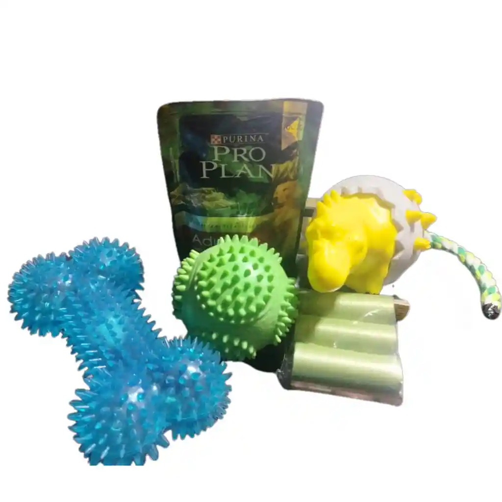 BIENVENOIDOS A VETMAK COMBO DE JUEGUETES PARA PERROS INCLUYE: 1 HUESO ANTI SARRO 1 PELOTA MACIZA 1 DINOSAURIO LIMPIA DIENTES 3 ROLLOS DE BOLSAS BIO DEGRADABLES 1 SOBRE DE COMUDA HUMEDA PROPLAN
