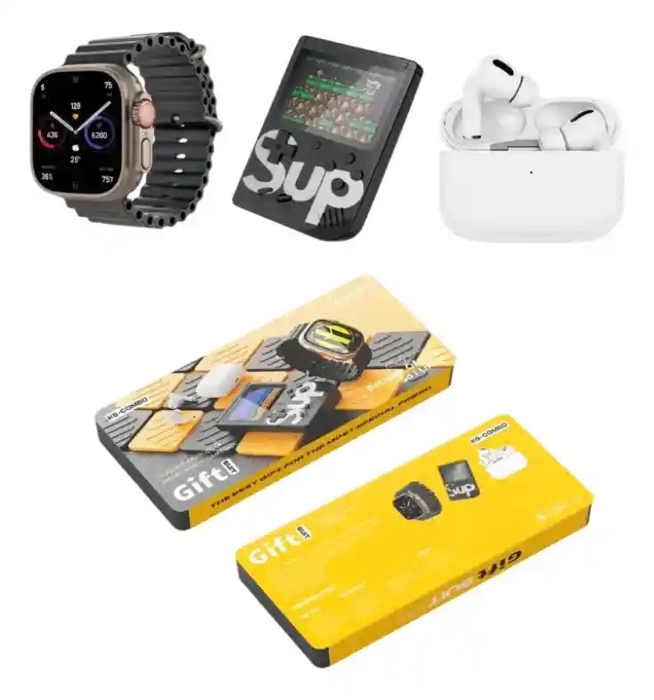 COMBO K5 RELOJ CON AUDÍFONOS Y SUP GIFT Diversión retro, estilo moderno Todo lo que necesitas para entretenerte. • Consola Retro SUP (400 en 1): Disfruta de los mejores videojuegos clásicos en una consola portátil. • Smartwatch Deportivo: Mide tus pasos, recibe notificaciones. • Auriculares Bluetooth: Escucha tu música favorita con total libertad. Compactos y con cargador.