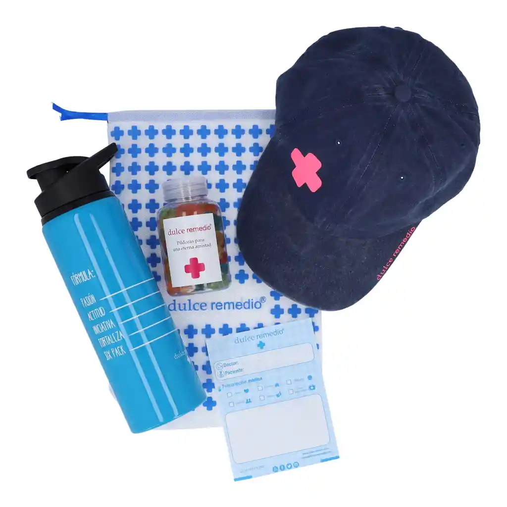 1 pastillero mediano de gomas con fórmula: Píldoras para una eterna amistad. 1 cachucha malla o tela1 termo six pack1 prescripción médica para que formules al paciente1 bolsa tela cambrel con cruces