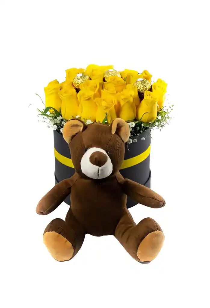 Hermoso combo de regalo contiene: estuche cilindro de lujo negro flores rosas decoradas y perfumadas acompañado de tres chocolates bombones Ferrero Rocher y un hermoso peluche oso de 35 CM incluye tarjeta personalizada Nota si desea dejar un mensaje porfavor dejarlo en el chat