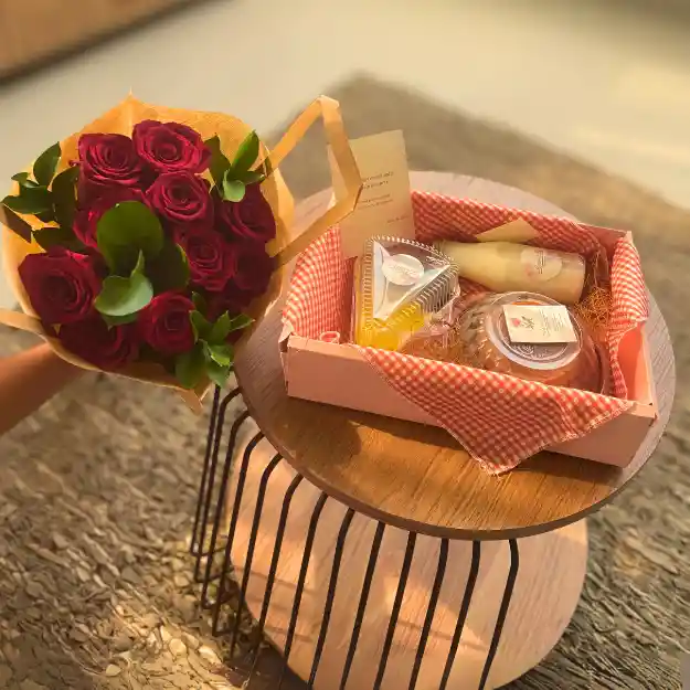 “Un detalle que enamora: 12 rosas rojas 🌹 + cheesecake 🍰 + chocoflan 🍫 + avena + tarjeta especial. ¡Regala amor y dulzura!”