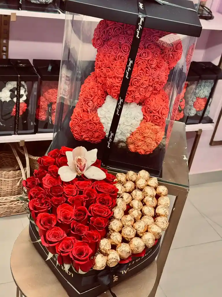 Caja de corazon mas orquídea grande, mas oso grande a disponibilidad de colores