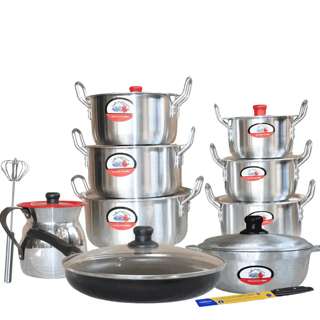 OLLA 14-24 PLATEADA X6 Olla #14 1 litros Olla #16 2, litros Olla #18 3 litros Olla #20 3,5 litros Olla #22 4,5 litros Olla #24 5,5 litros CALDERO 2 de 19cm para 300gr OLLETA 2 litros BATIDOR manual CUCHILLO con mango de pasta SARTEN ANTIADHERENTE de 24cm CON TAPA DE VIDRIO