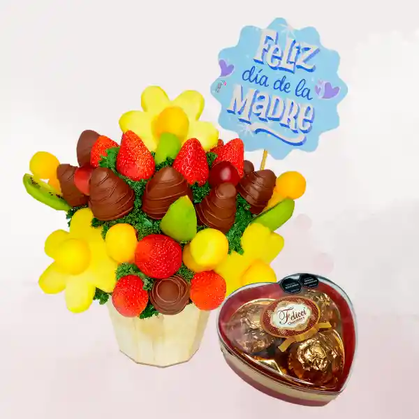 Ramo de fresas con: Flores de piña Fresas naturales Fresas con chocolate tradicional Melón kiwi Uvas Cofre por 5 chocolates Dolcebon (El cofre puede llegar dorado o rojo) Dedicatoria: Feliz día Mamá (Puede llegar en color azul pastel o rosa)