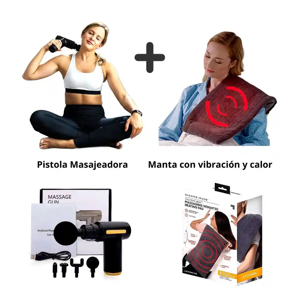 Combo Masajeador Muscular: Manta + pistola Son perfectas para después del ejercicio, trabajo... para relajar los músculos, para aliviar el dolor muscular. La pistola cuenta con cuatro cabezales y función de 6 velocidades. CARACTERÍSTICAS - Reducir la acumulación de ácido láctico en el músculo. - Aumenta la movilidad articular. - Eliminar la fatiga muscular. - Cambio de 4 niveles, velocidad ajustable. - La manta posee 3 funciones: calienta, vibra, calienta y vibra al mismo tiempo. DESCRIPCIÓN: Pistola * Funciones de masaje: Percusión, alivio del dolor * Tipo: Pistola de Masaje * Voltaje: 5V * Zona del cuerpo: Brazo, Espalda, Cuerpo entero * Material: ABS+Plástico * Alimentación: USB * Potencia nominal: 24W * Solo pesa 1.6 lb Manta * Material: fieltro de poliéster con arcilla granulada * Fuente de alimentación: 110V-220V (voltaje) * Salida: 5v 10W * Apagado automático después de 2 horas de uso * Tamaño aproximado: 59 * 31 *1,5cm El paquete incluye: 1 * manta masajeadora 1 * Pistola de masaje 4 * Cabezas de masaje: cabeza de horquilla, cabeza de bola, cabeza de bala, cabeza plana 1 * manual de usuario 2 * Cables de carga USB tipo C ¿Qué esperas para usarlo?