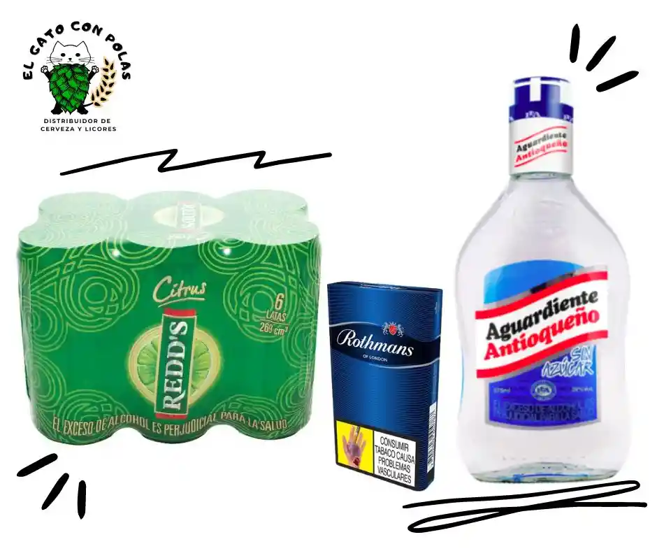 Contenido: * 1 Sixpack Redd's Cerveza Citrus 269 mL * 1 Aguardiente Antioqueño azul 375 mL * Cigarrillos Rothmans azul XL x 10 unidades. Prohíbase el expendio de bebidas embriagantes a menores de edad. El exceso de alcohol es perjudicial para la salud.