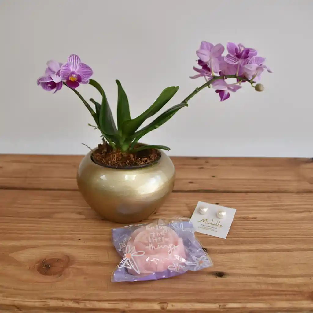 Detalle delicado con mini orquídea natural, matera de cerámica, jabón artesanal y aretes tipo topito. Ideal para regalar 💕